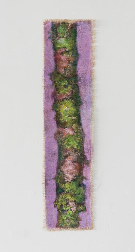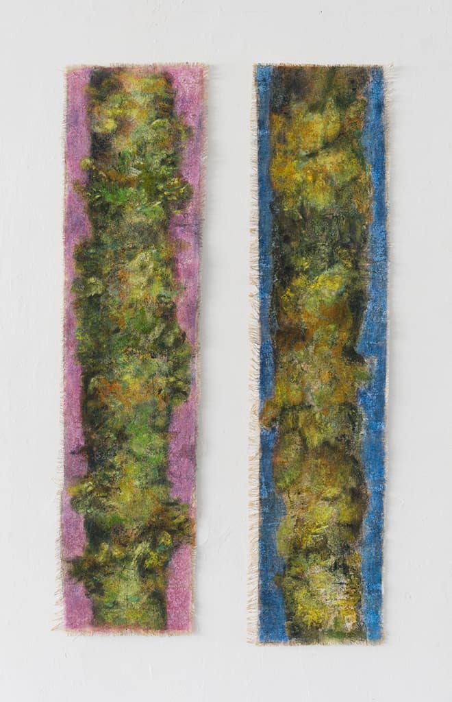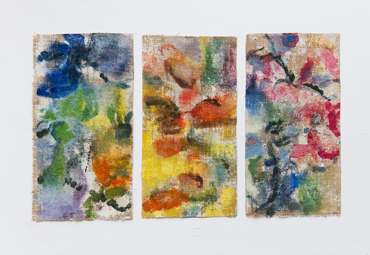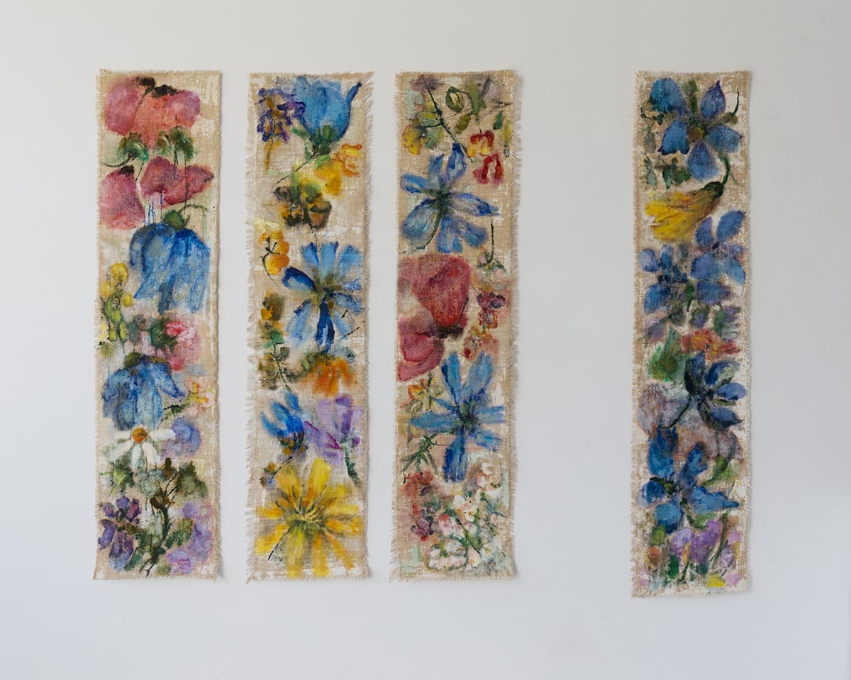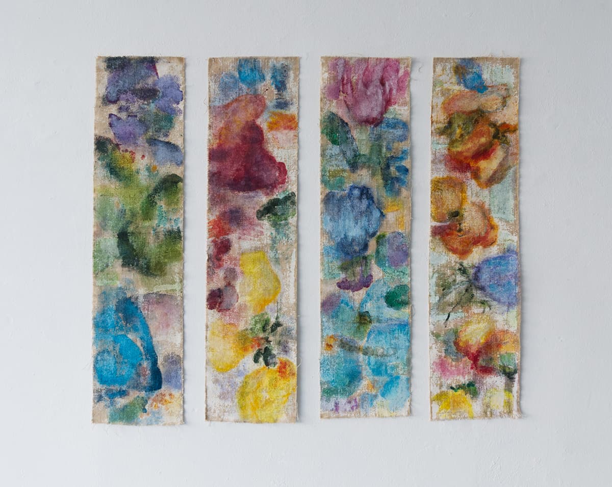 Um das Werden und Vergehen geht es auch in der Reihe „Blütenpfad“. Zugrunde liegen diesen Arbeiten am Wegrand aufgelesene Blüten, die ich während des spazieren Gehens auf einen Armreifen aus Kreppband klebe. Blüten markieren die Natur an ihrem Höhepunkt. Sie sind Ausdruck ihrer vergänglichen Schönheit und Verletzlichkeit.